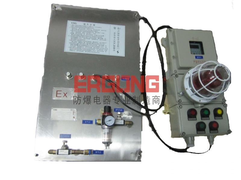 正壓柜在自動(dòng)控制系統(tǒng)的控制下,通入保護(hù)氣體,正壓腔內(nèi)壓力高于正壓腔外的壓力,形成微正壓的安全小環(huán)境,從而阻止了可燃性危險(xiǎn)氣體進(jìn)入正壓腔內(nèi),保證內(nèi)裝普通儀表和電器元件的安全運(yùn)行。